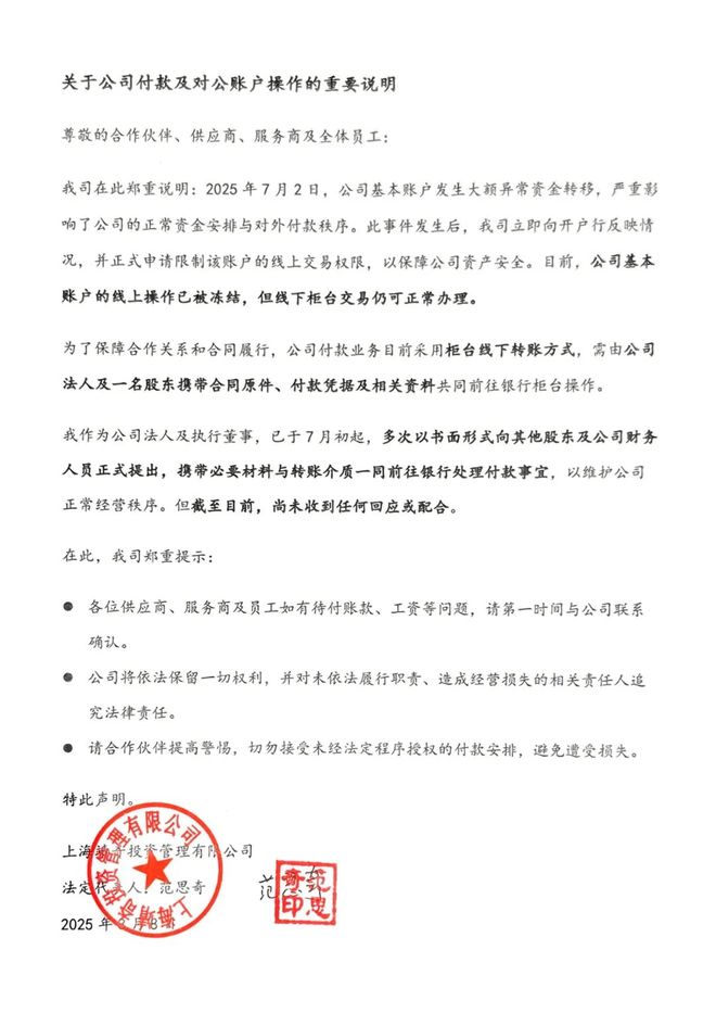 8月8日,范思奇再在公众号发布说明,7月2日公司基本账户有大额资金被异常转出,严重影响公司正常资金安排;目前,公司基本账户的线上操作已被冻结,但线下柜台交易仍可正常办理。