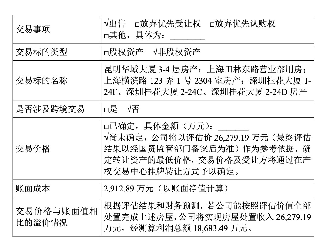 2026年2月,红塔证券发布公告,其分布在昆明、上海、深圳等地的6处房产在北京产权交易所完成挂牌,总挂牌价格高达2.63亿元。更令人意外的是,这批房产的账面净值仅2912.89万元,评估增值率高达802.17%,若按评估价成交,红塔证券将直接实现利润总额约1.87亿元。