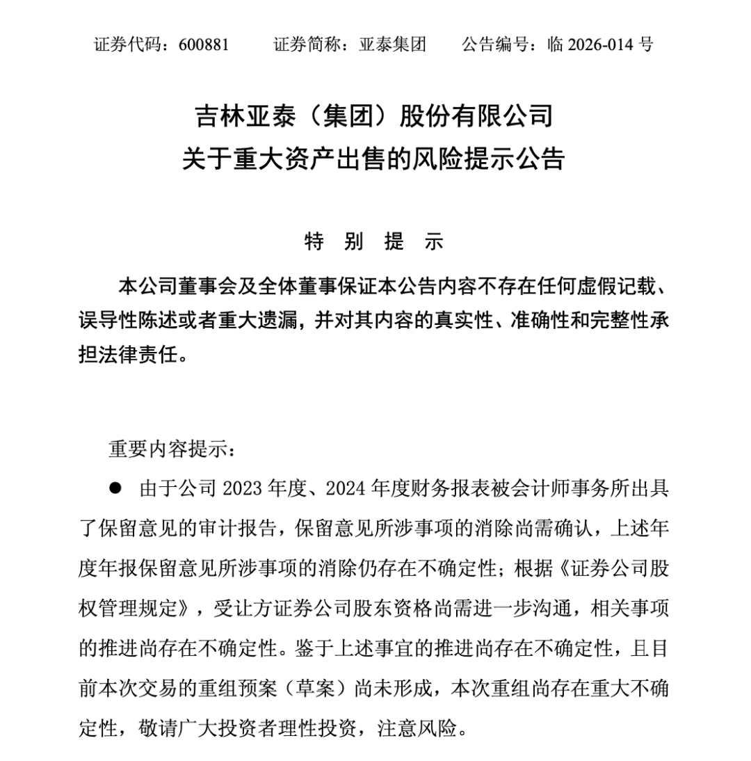 亚泰集团2025年预计亏损16亿至23亿元,水泥与房地产两大主业双双陷入泥潭,出售东北证券股权是其为数不多的“回血”选择,但受让方股东资格仍需监管审批,且亚泰集团连续两年财报被出具保留意见,这些硬伤让交易陷入不确定性。