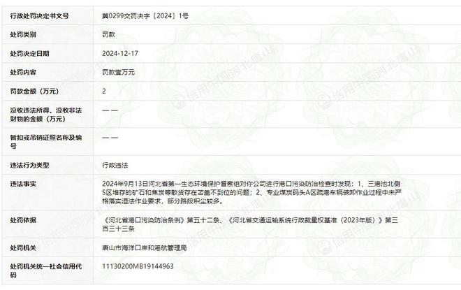 唐山港集团股份有限公司,2024年9月13日河北省第一生态环境保护督察组对你公司进行港口污染防治检查时发现:1、三港池北侧S区堆存的矿石和焦炭等散货存在苫盖不到位的问题;2、专业煤炭码头A区疏港车辆装卸作业过程中未严格落实湿法作业要求,部分路段积尘较多。依据《河北省港口污染防治条例》第五十二条、《河北省交通运输系统行政裁量权基准(2023年版)》第三百三十三条,罚款壹万元。