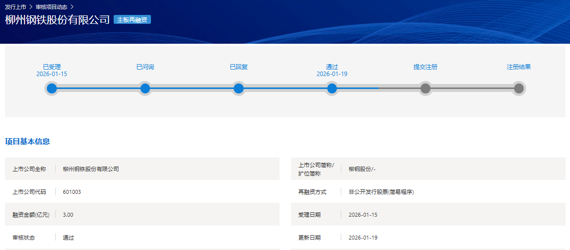 中国经济网北京1月20日讯据上交所网站消息,柳州钢铁股份有限公司(简称“柳钢股份”,601003.SH)非公开发行股票项目于1月19日审核通过。