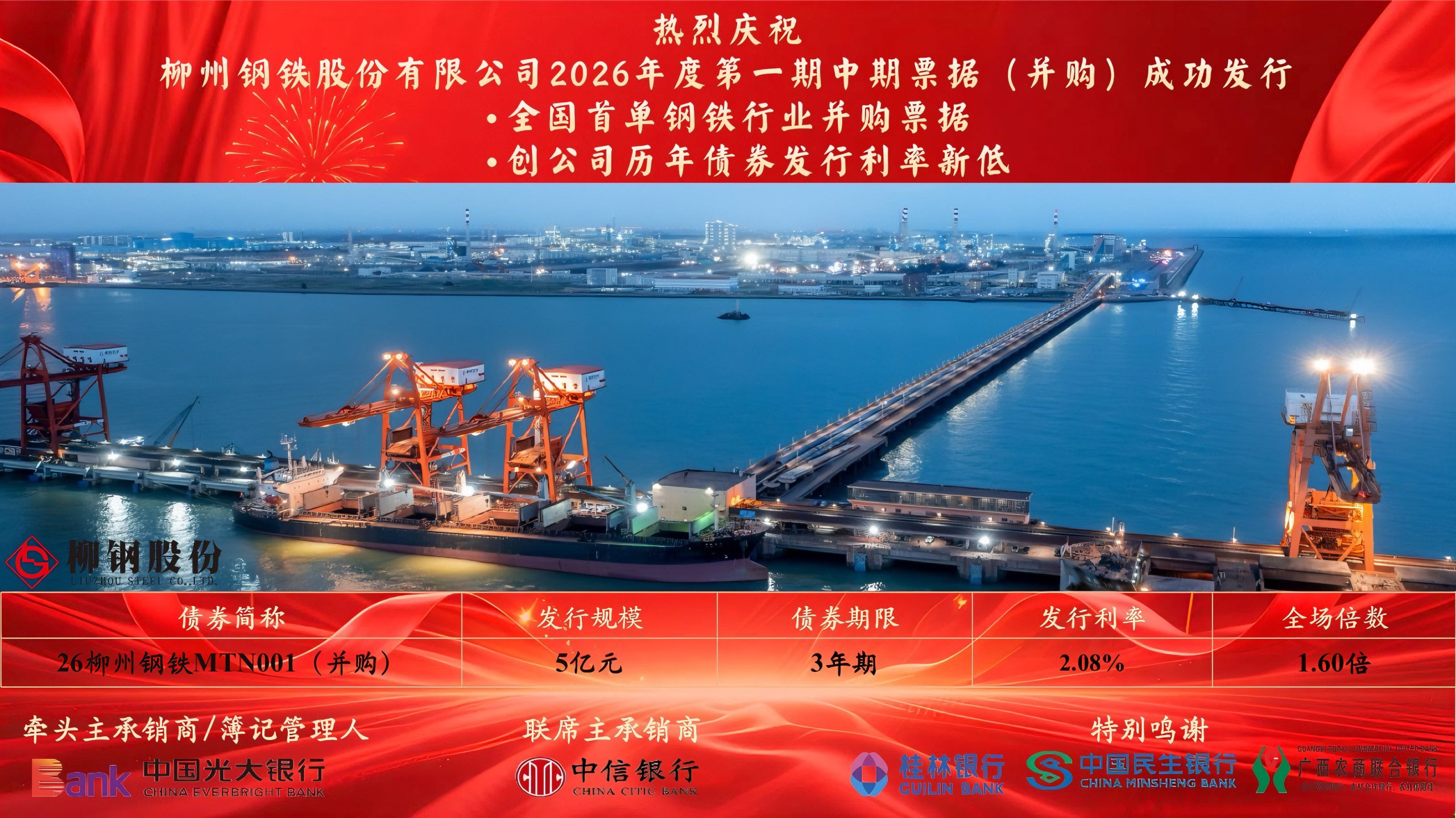 3月12日,柳州钢铁股份有限公司(简称柳钢股份)2026年第一期并购票据在银行间债券市场圆满发行。本期票据发行规模5亿元,期限3年,票面利率2.08%,既是全国首单钢铁行业并购票据,也创下柳钢股份债券发行利率新低。
