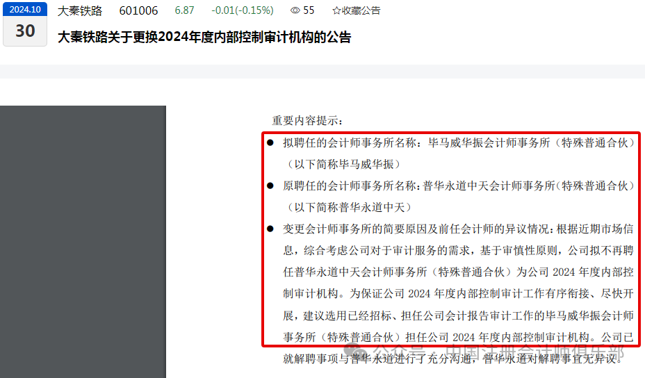 大秦铁路2024年10月30日公告宣布,根据近期市场信息,综合考虑公司对于审计服务的需求,基于审慎性原则,公司拟不再聘任普华永道中天会计师事务所(特殊普通合伙)为公司2024年度内部控制审计机构。为保证公司2024年度内部控制审计工作有序衔接、尽快开展,建议选用已经招标、担任公司会计报告审计工作的毕马威华振会计师事务所(特殊普通合伙)担任公司2024年度内部控制审计机构。2024年度本项目的审计收费为人民币350万元,较上一年审计费用持平。
