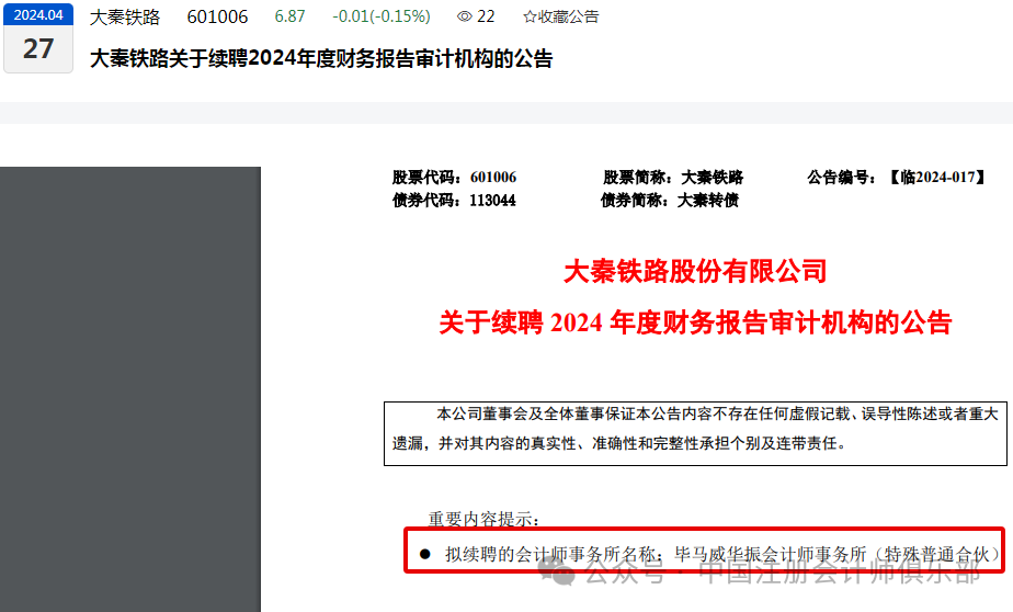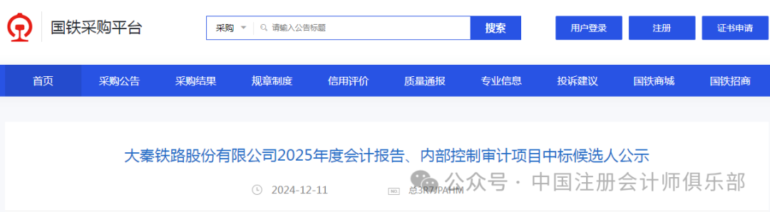 2024年12月11日,大秦铁路股份有限公司2025年度会计报告、内部控制审计项目中标候选人公示,包件一大秦铁路股份有限公司合并及分子公司2025年度会计报告审计服务中标候选人第一名为信永中和会计师事务所(特殊普通合伙),报价806万元;包件二大秦铁路股份有限公司合并及分子公司2025年度内部控制审计服务中标候选人第一名为安永华明会计师事务所(特殊普通合伙),报价:315万元。