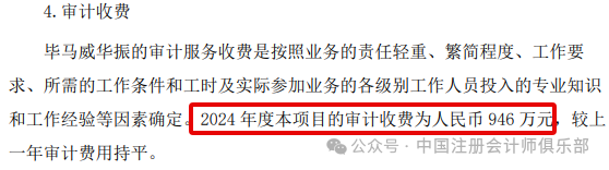 大秦铁路2024年4月27日发布公告表示,续聘毕马威华振会计师事务所(特殊普通合伙)为公司2024年度财务报告审计机构。2024年度本项目的审计收费为人民币946万元,较上一年审计费用持平。