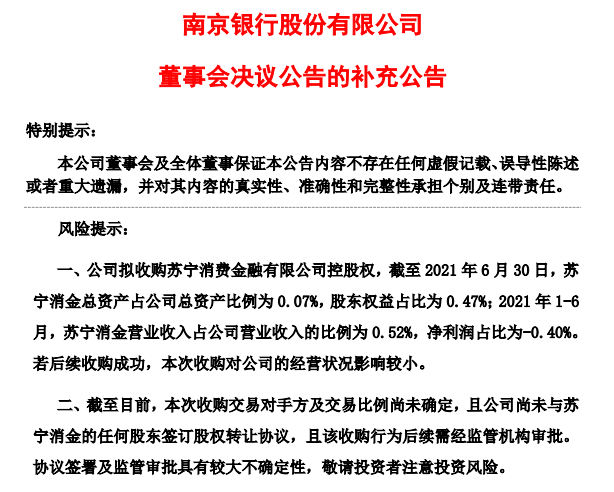 近日,南京银行股份有限公司(以下简称“南京银行”)发布《董事会决议公告的补充公告》(以下简称“公告”),表示其拟收购苏宁消费金融有限公司(以下简称“苏宁消金”)控股权。