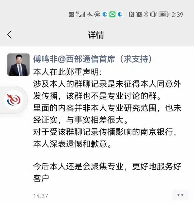 在股市表现的跌宕起伏之下,“西部证券通信首席傅鸣非”在某群聊中发布的观点或成为导火索,并将南京银行推上舆论的风口浪尖。