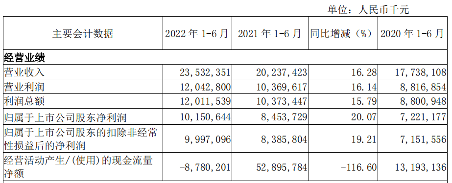 2022年上半年,南京银行实现营业收入235.32亿元,同比增加32.95亿元,同比增长16.28%;实现归属于母公司股东的净利润101.51亿元,同比增加16.97亿元,同比上升20.07%。