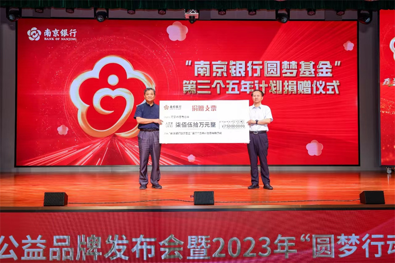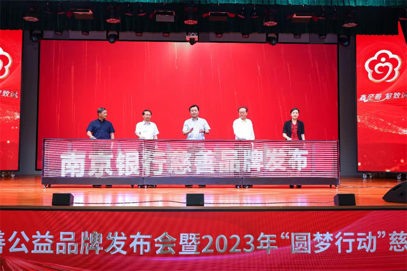 2023年8月18日,南京银行“鑫意”慈善公益品牌发布会暨2023年“圆梦行动”慈善助学款发放仪式在宁举行。南京市慈善总会会长林克勤、副会长谢跃进,南京市民政局副局长陈雪梅,南京银行党委书记、董事长胡昇荣,党委副书记、监事长吕冬阳等出席活动,共同为“鑫意”慈善品牌发布启幕。
