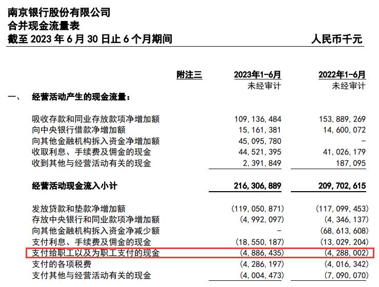 今年上半年,南京银行支付给职工以及为职工支付的现金为48.86亿元,上年同期为42.88亿元。