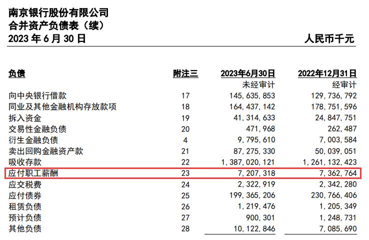 截至2023年6月末,南京银行应付职工薪酬为72.07亿元,上年末为73.63亿元。