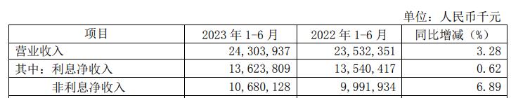 2023年1-6月,南京银行实现利息净收入136.24亿元,同比增加0.83亿元,同比上升0.62%;非利息净收入106.80亿元,同比增加6.88亿元,同比上升6.89%。