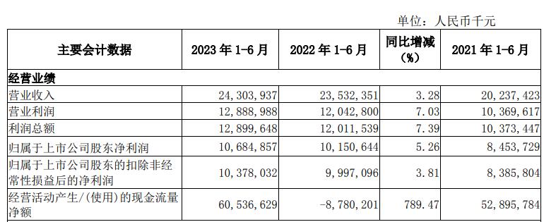 昨晚,南京银行发布2023年半年度报告。今年上半年,南京银行实现营业收入243.04亿元,同比增长3.28%;归属于上市公司股东净利润106.85亿元,同比增长5.26%;归属于上市公司股东的扣除非经常性损益后的净利润103.78亿元,同比增长3.81%;经营活动产生的现金流量净额 605.37亿元,上年同期-87.8亿元。