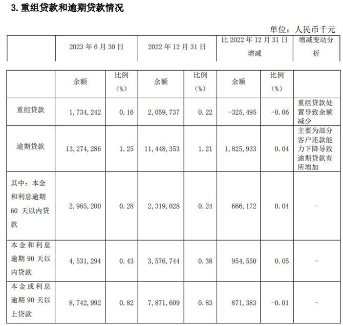 截至2023年6月30日,南京银行逾期贷款余额132.74亿元,占比1.25%,其中:本金和利息逾期60天以内贷款29.85亿元,本金和利息逾期90天以内贷款45.31亿元,本金或利息逾期90天以上贷款87.43亿元。