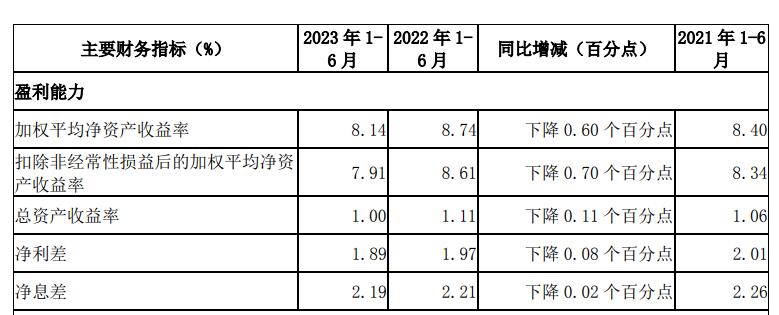 2023年1-6月,南京银行的加权平均净资产收益率为8.14%,比去年同期下降0.60个百分点;扣除非经常性损益后的加权平均净资产收益率为7.91%,比去年同期下降0.70个百分点。