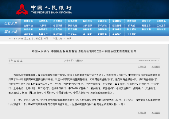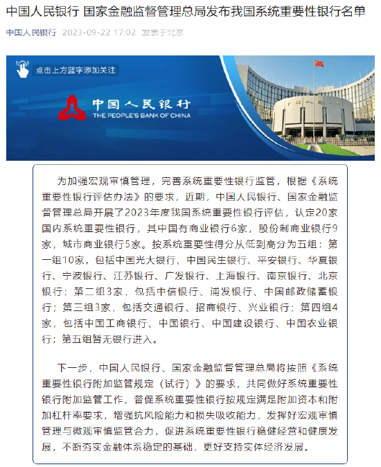 9月22日金融一线消息,中国人民银行、国家金融监督管理总局发布2023年我国系统重要性银行名单,认定20家国内系统重要性银行,其中国有商业银行6家,股份制商业银行9家,城市商业银行5家。