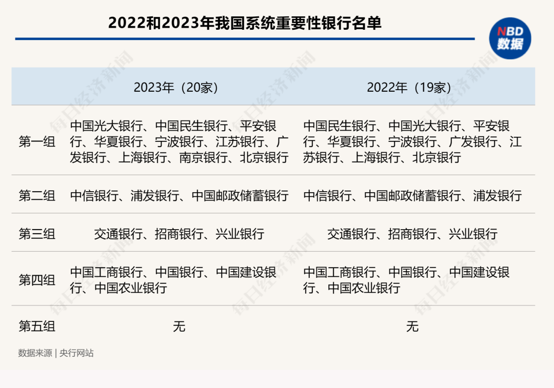 《每日经济新闻》记者对比发现,与2022年相比,今年入选银行数量为20家,较去年新增1家,南京银行首次入围,并位列系统重要性银行第一组。其余银行名单及分组并未发生变化。