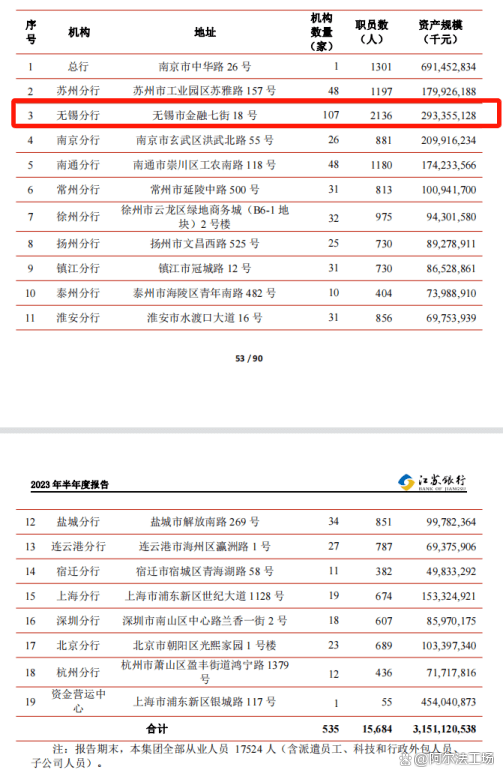江苏银行无锡分行的网点、职员数、资产规模均大于其他分行,来源:江苏银行半年报