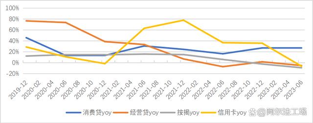 截至2023年6月末,南京银行按揭、经营贷、信用卡同比增速下降,来源:各银行财报,阿尔法工场整理