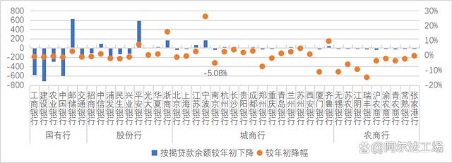 截至2023年6月末,南京银行按揭贷款余额下降规模较大(单位:亿元),来源:各银行财报,阿尔法工场整理