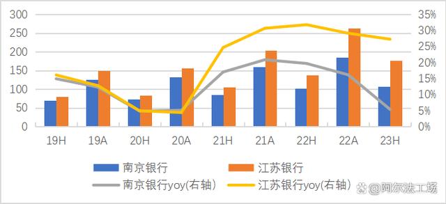 近年江苏银行净利润增速远高于南京银行(单位:亿元),来源:各银行财报,阿尔法工场整理