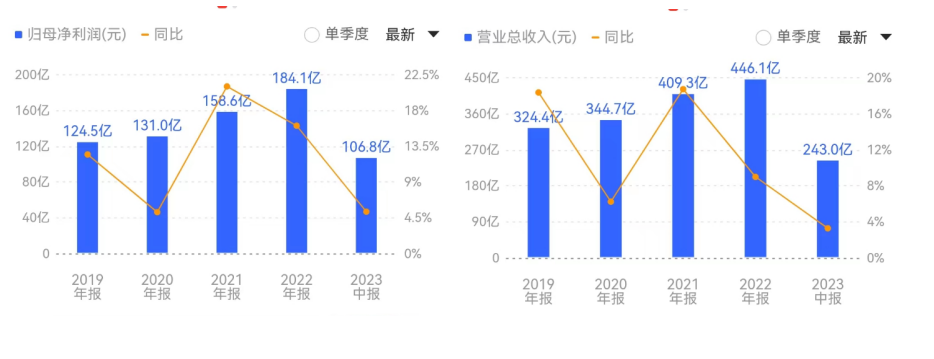 每股收益也出现了大幅下滑,从2021年的1.54元,到2022的1.76元,到今年上半年仅有1.03元,这一水平甚至比2019年、2020年都跌去了近三四成。