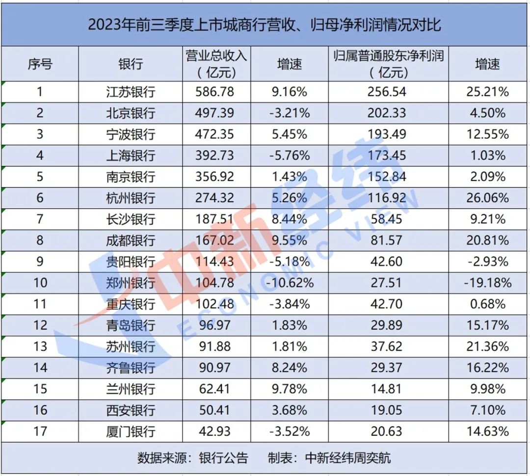 2023年前三季度,A股17家上市城商行中,有11家营收超过100亿元。其中,江苏银行凭借587亿元营收位居榜首,北京银行次之,实现营收497亿元,宁波银行、上海银行、南京银行分别以472亿元、393亿元、357亿元的营收位列其后。