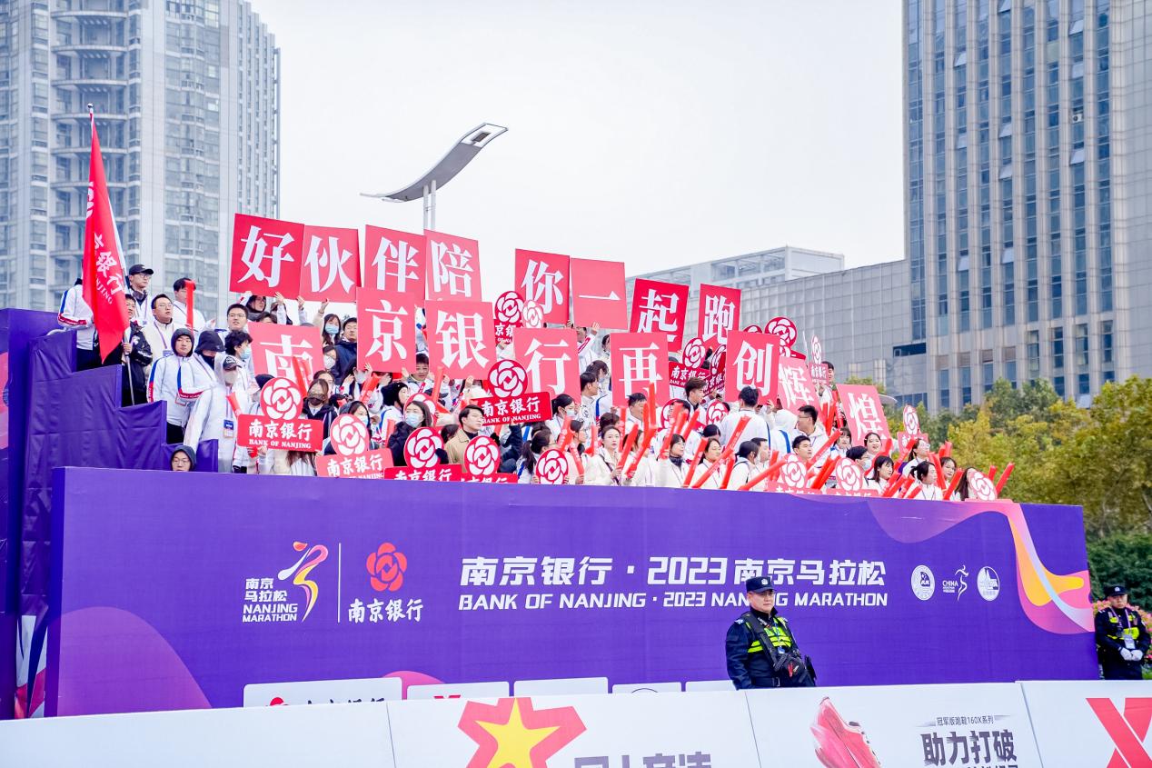 12日清晨,南京银行跑团高举旗帜跑过主席台,矫健的跑姿、青春的笑容显示着积极向上的“南银”面貌。起点看台上,由100名员工组成的拉拉队方阵,为奔跑的选手热情呐喊,他们高举“南京银行再创辉煌”“好伙伴陪你一起跑”的加油牌,为南马选手们鼓劲助威。
