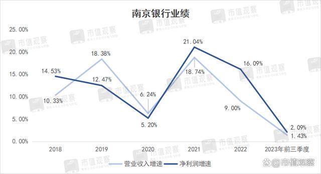 2023年前三季度南京银行的营收和净利润增速已经降到了2%左右,相对于2021年和2022年10%以上增速大幅下滑,甚至不如2020年的增长水平。
