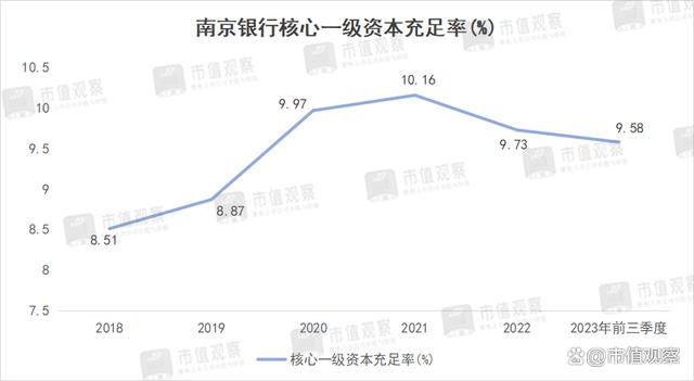 除此之外,困扰南京银行的另一大忧虑,是核充率的不断下降从而限制资产规模的增长,此前董事长胡昇荣也曾经强调过这一问题。2023年前三季度公司的核心一级资本充足率为9.58%,相较于2021年的10.16%回落不少。