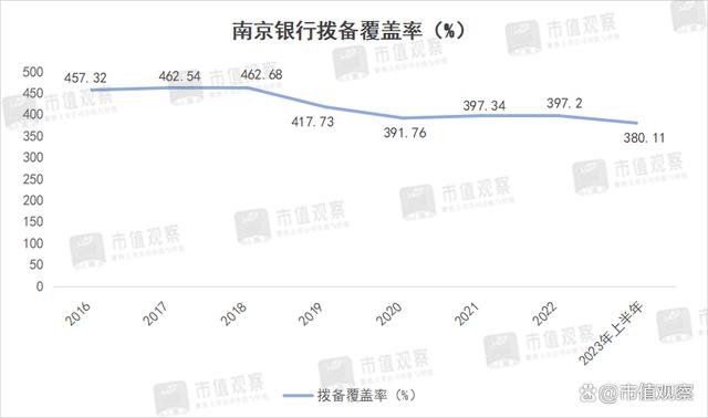 南京银行的拨备覆盖率也出现较为明显的下降,由2022年的397.2%降至2023年上半年的380.11%。事实上近年来公司的拨备率一直处在下降的趋势,2018年曾达462.68%,此后便一路下滑,不断释放“储粮”补充流动性。