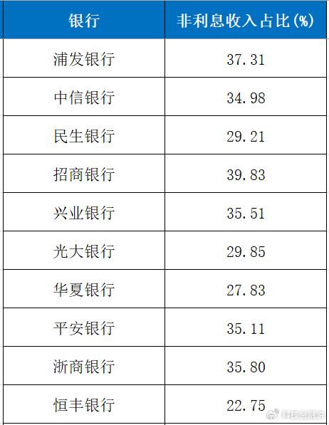 和六大行相比,统计在列的10家股份行的整体表现更胜一筹。六大行中,只有交通银行的非息收入占比达到30%以上,股份行中则有6家达30%以上,包括浦发银行(37.31%)、中信银行(34.98%)、招商银行(39.83)、兴业银行(35.51%)、平安银行(35.11%)、浙商银行(35.8%)。