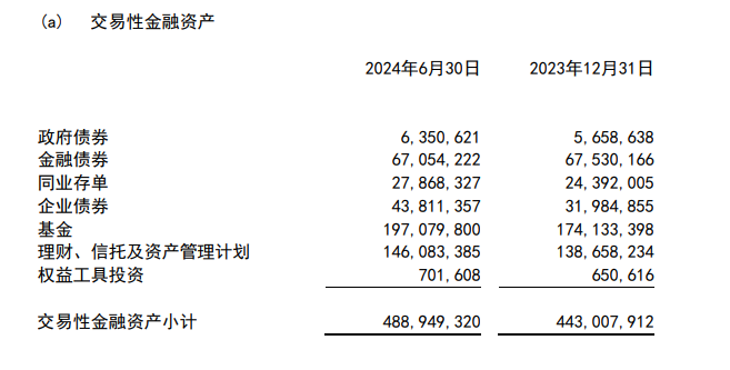 2024年上半年,南京银行交易性金融资产余额4889.49亿,主要包括政府债券、金融债券、同业存单、企业债券、基金等。