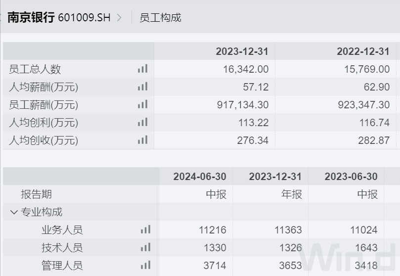 另根据半年报披露,截至6月30日,南京银行员工总数大约1.63万人,和去年末相比略有减少。去年,该行人均创利超过113万元,人均薪酬57万元,比2022年减少约5.7万元。
