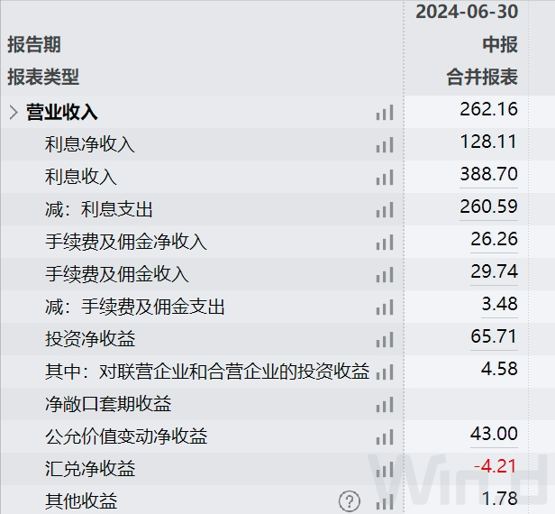 投资与公允价值变动收益合计约108亿元,比去年同期的88亿元增加20亿元,占非利息收入27亿元增量的主要部分。换言之,今年上半年营收比去年同期增加19亿元,主要增量也来自投资与公允价值变动收益的增加。