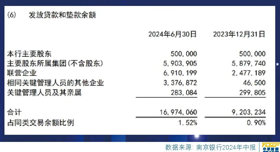 尤其值得关注的是关联交易贷款。据中报信息,最近半年南京银行的关联交易处于大幅飙升趋势。其中,联营企业贷款和垫款余额增加近1.8倍,相同关键管理人员的其他企业放贷和垫款余额暴增70倍。该类贷款占同类交易余额比例,由去年末的0.9%上升至1.52%。