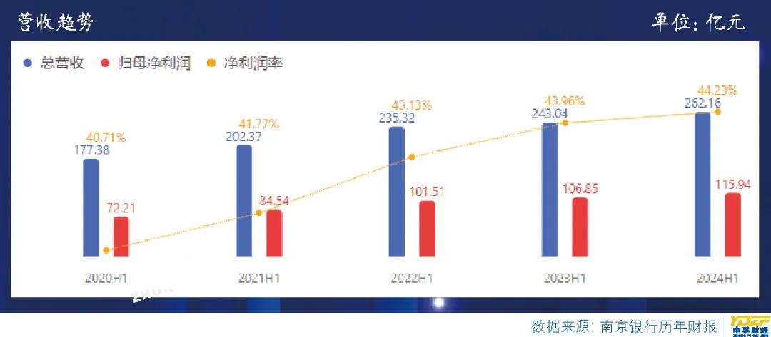 2024年上半年,南京银行实现营业收入262.16亿元,同比增长7.87%;归属于母公司股东的净利润达到115.94亿元,同比增长8.51%。净利润率高达44.23%,对比前几年同期的数据,净利润率呈现持续增长趋势。