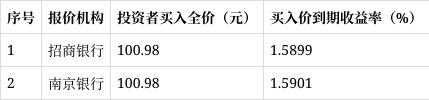 9月26日,中央国债登记结算有限责任公司官网披露柜台流通式债券报价信息,“24国开01”(代码240201)最优买报价方为南京银行,该债券剩余期限161天,投资者最优买入价到期收益率1.5901%。