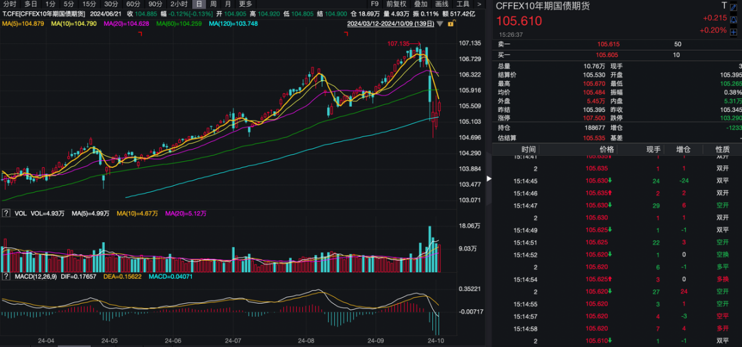 值得注意的是,随着近期A股市场的大幅波动,债券市场也出现较大调整。30年期,10年期和5年期国债期货主力合约,纷纷在高点下挫之后,近日有所回升。截至10月9日收盘,30年期国债期货主力合约翻红,涨0.81%,10年期主力合约涨0.20%。此外,5年期主力合约涨0.06%,2年期主力合约跌0.01%。