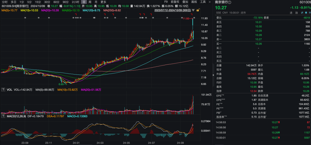 10月9日,受大盘指数影响,南京银行(601009.SH)股价遭遇大跌。