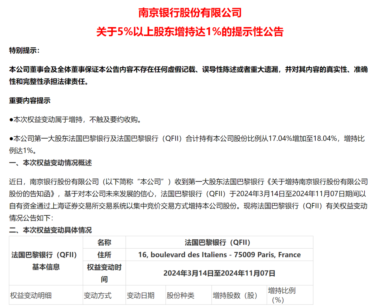 公告显示,法国巴黎银行基于对南京银行未来发展的信心,于2024年3月14日至2024年11月7日期间,通过上海证券交易所交易系统以集中竞价交易方式增持了该行股份。本次增持的资金来源均为自有资金,不存在违反相关法律法规规定及其相关承诺的情况。