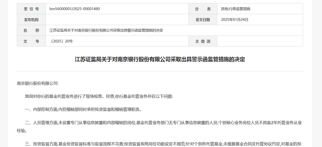 2025年1月24日,江苏证监局发布行政监管措施决定书,指出南京银行基金托管业务存在四项违规问题。监管检查发现,该行内控稽核部同时承担投资监督和稽核管理职责,两项核心职能未实现分离,违反《证券投资基金托管业务管理办法》中关于内部控制制衡的要求。在人员配置上,基金托管业务部门未设置专门信息披露岗位,且个别核心业务岗位人员未满足“具备2年以上托管业务从业经验”的监管标准,业务专业性存疑。监管文件显示,南京银行基金投资监督标准与流程不完善,投资监督系统岗位功能设定不规范,对部分所托管基金,未按基金合同及托管协议约定,对投资范围、投资比例、投资风格等实施有效监督。此外,该行2023年10月发生住所变更后,未按规定向证监会或江苏证监局报告,信息报送义务履行不到位。针对上述问题,江苏证监局已对南京银行采取出具警示函的监管措施,并要求其在30日内提交书面整改报告。