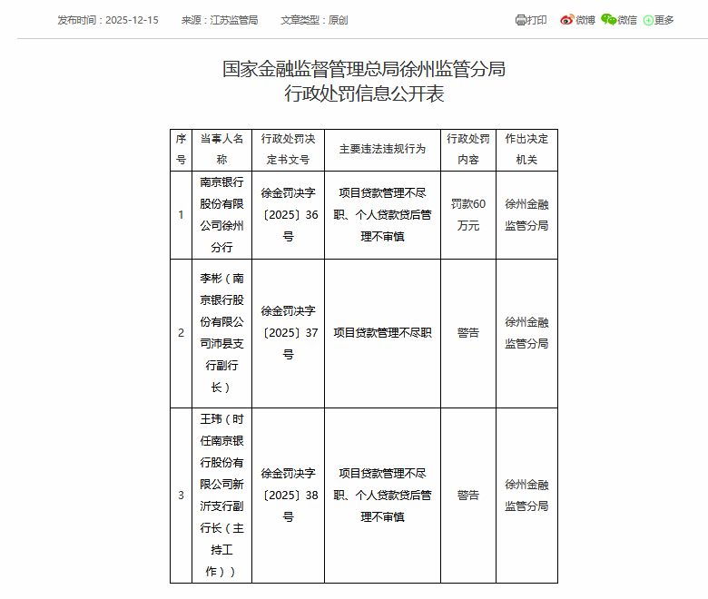 2025年12月15日,南京银行徐州分行因项目贷款管理不尽职、个人贷款贷后管理不审慎,被徐州金融监管分局罚款60万元,两名相关责任人均被警告。
