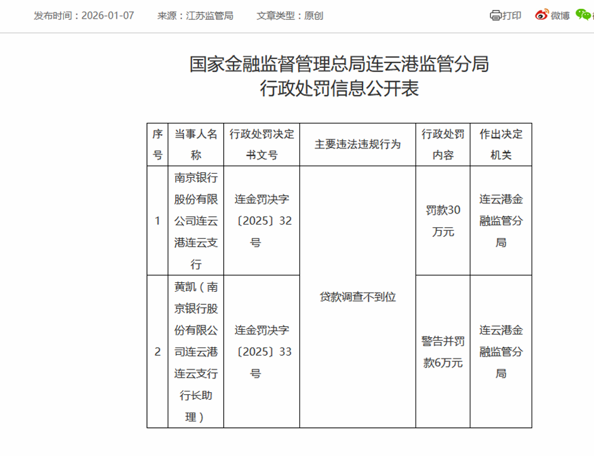 2026年,南京银行因信贷业务不合规受罚。1月7日,国家金融监督管理总局连云港监管分局公布两张行政处罚信息公开表(连金罚决字〔2025〕32号、33号),南京银行连云港连云支行因贷款调查不到位,被罚款30万元;一名相关责任人被警告并罚款6万元。