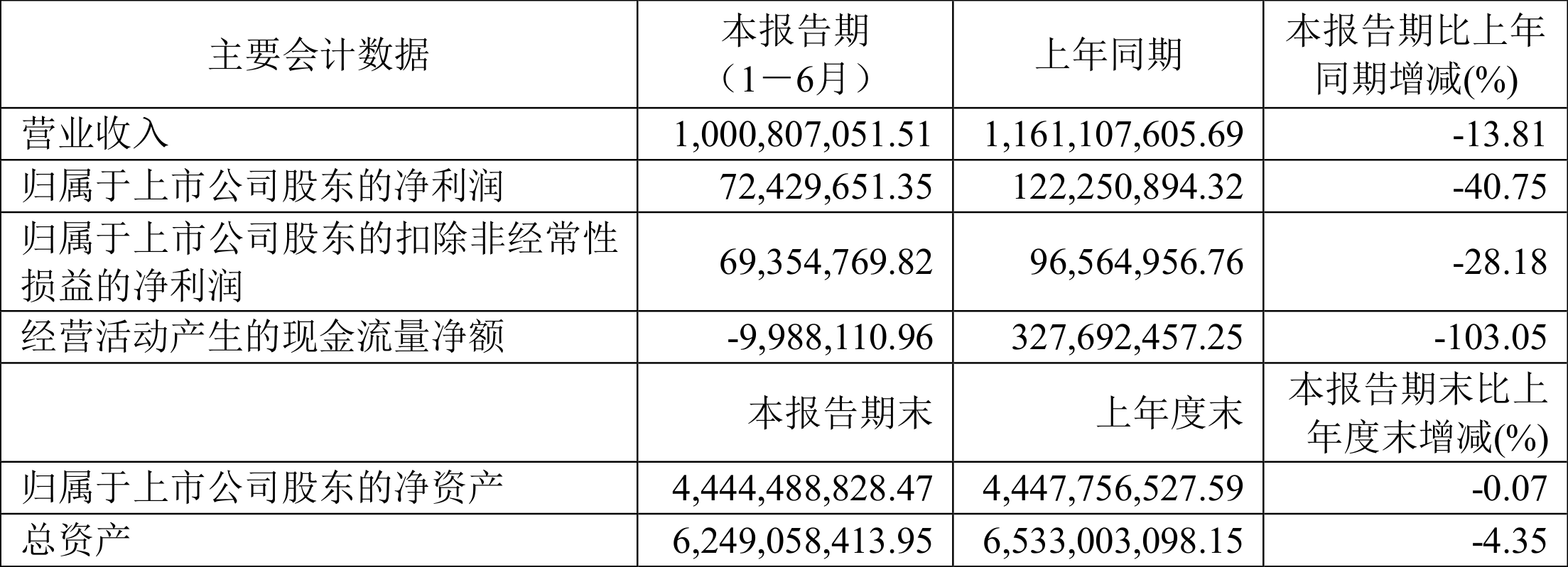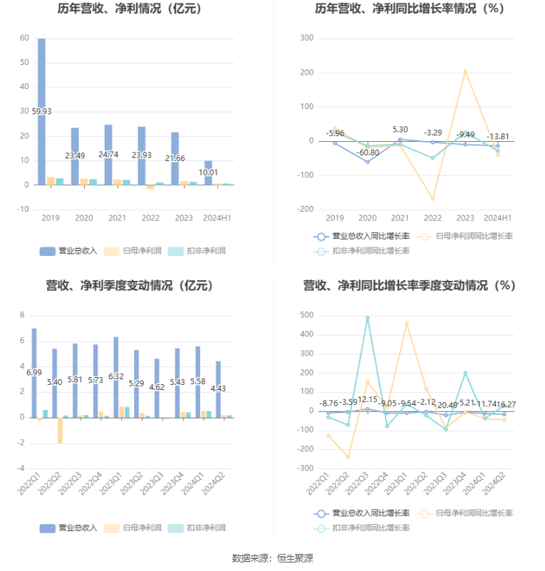 2024年上半年,公司经营活动现金流净额为-998.81万元,同比减少3.38亿元;筹资活动现金流净额-1.27亿元,同比减少929.13万元;投资活动现金流净额1989.42万元,上年同期为1.36亿元。