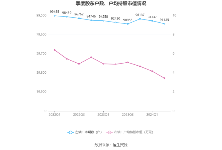 筹码集中度方面,截至2024年上半年末,公司股东总户数为9.11万户,较一季度末下降了3002户,降幅3.19%;户均持股市值由一季度末的4.18万元下降至3.45万元,降幅为17.46%。