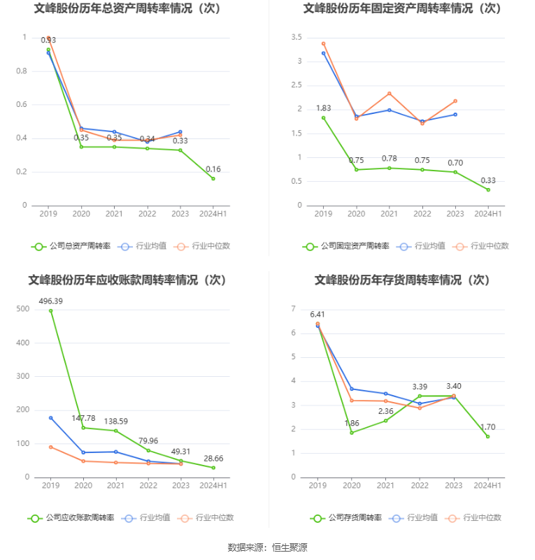 营运能力方面,2024年上半年,公司公司总资产周转率为0.16次,上年同期为0.17次(2023年上半年行业平均值为0.22次,公司位居同行业12/15);固定资产周转率为0.33次,上年同期为0.37次(2023年上半年行业平均值为1.03次,公司位居同行业14/15);公司应收账款周转率、存货周转率分别为28.66次、1.70次。