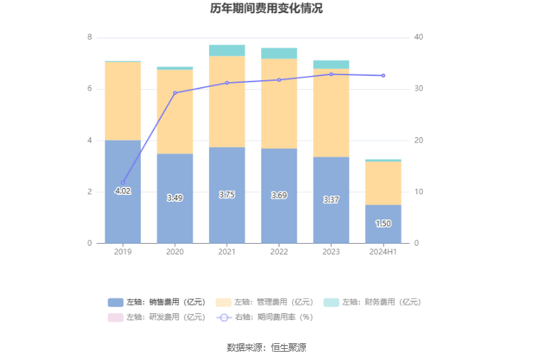 2024年上半年,公司期间费用为3.27亿元,较上年同期减少4004.21万元;但期间费用率为32.63%,较上年同期上升1.06个百分点。其中,销售费用同比下降10.67%,管理费用同比下降4.69%,财务费用同比下降59.77%。