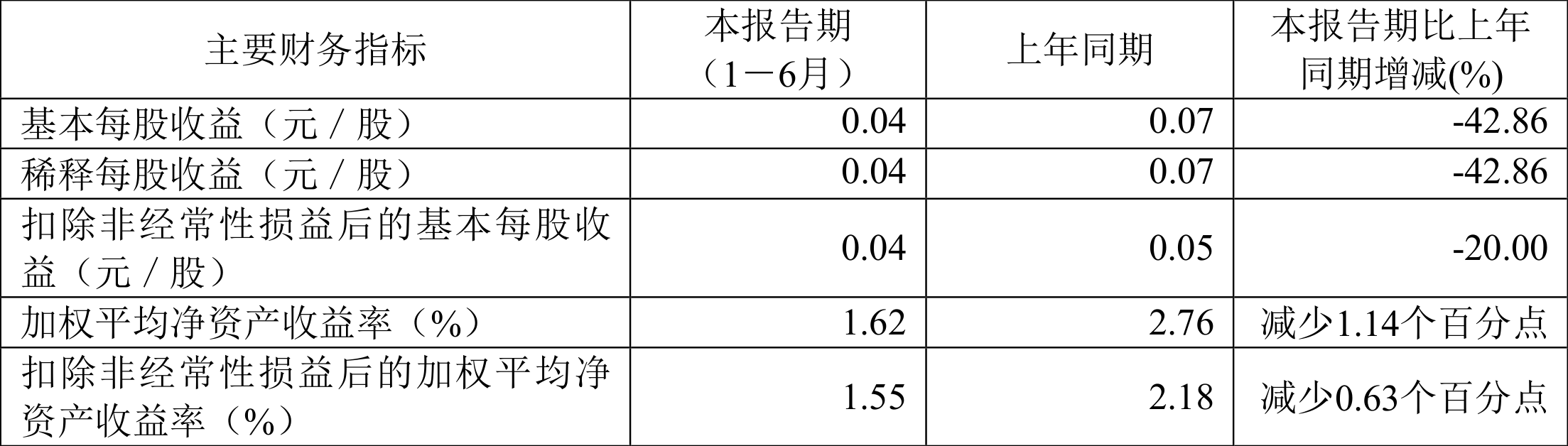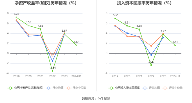 数据显示,2024年上半年公司加权平均净资产收益率为1.62%,较上年同期下降1.14个百分点;公司2024年上半年投入资本回报率为1.61%,较上年同期下降1.11个百分点。