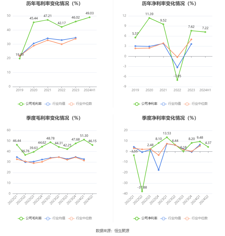 2024年上半年,公司毛利率为49.03%,同比上升2.29个百分点;净利率为7.22%,较上年同期下降3.08个百分点。从单季度指标来看,2024年第二季度公司毛利率为46.15%,同比上升1.84个百分点,环比下降5.15个百分点;净利率为4.37%,较上年同期下降2.07个百分点,较上一季度下降5.11个百分点。
